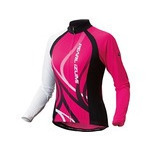 紫外線対策万全の夏用長袖ジャージです。汗をかいてもすぐに乾いて、真夏でもさらっとした涼しさ。袖口には風を取り込むファスナー付き。首が日焼けしないよう襟は高めの仕様です。ウエストを引き締めて見せる曲線を施したデザインも視覚効果抜群です。