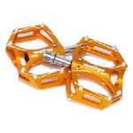 ■M194 CNCアルミフラットペダルカラー:ゴールド素材: アルミニウム 6061 重量: 247g サイズ: 90.1mm x 64.8mm x 27.7mm ベアリング : シールドスピンドル : クロモリ・材質に強度、耐食性ともに優れ、特に強度が高いとされる「6061 アルミニウム」を採用しました。・CNC加工による高精度なアルミ切削処理で、高い強度とハイセンスなデザインを両立しています。・アルミニウムの耐食性や耐摩耗性を向上させ、鮮やかなカラーを着色させ装飾した「アルマイト」表面処理。・スムーズなペダリングが可能なシールドベアリングを採用しました。・取り外し可能なピンが8ヶ所配置されており、グリップ力を高めます。