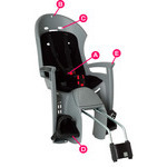 型番:121-5520-08シートをホールドするこの2つのパーツが、他にはない安全性と快適性をもたらします。後キャリアー付き、無し、いずれの自転車にも取付けられます。●カラー : ミディアム グレー/ブラック●シート チューブに装着●最大荷重 : 22kg●L300 x W400 x H780mmA:頭からかぶせるのではなく、一方のベルを肩越しに前で固定。 もう一方を胸元で固定する便利な3点式安全シートベルト。 すべて片手でできるので、もう一方の手はしっかりと自転車を支えることができます。B:ヘルメット着用時に後頭部があたらないよう、 背もたれ上部に余裕を持たせたフォルムを採用。C:成長にあわせて3段階に高さを調整できるシートベルトD:成長にあわせて4段階に高さを調整できる足乗せE:グリップ付アームレスト