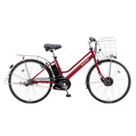 『ビビチャージ・AT 』走りながら発電・充電できる回生充電システムを採用した最長距離シティモデル。※。(※当社最長距離走行モデル)■バッテリー容量 17.6Ah■充電時間 約 6.0時間■走行距離:(業界統一テスト条件)パワーモード走行 約 80kmオートマチックモード走行 約 98kmロングモード走行 約 180km<主要装備>■スタンド式専用充電器(急速充電):大容量バッテリーに対応した急速充電器。充電時間を大幅に短縮します。■オートOFFシステム:停止して10分以上経つと、自動的に電源が切れる親切機能です。■ハードランナータイヤ :外面部が磨耗しにくいタイヤです。■Wピボットハイパワーブレーキ:金属粒子が緻密で強度が上がり、軽く薄くできる鍛造加工でさらにブレーキの強度がアップ。フロントブレーキに採用し、軽い力でしっかりブレーキング。■サイレントシュー:ブレーキ時のいやな音鳴りがしにくい親切設計。さらに制動力がアップしました。■ステンレスリム:リム、スポークはさびにくく、耐久性に優れたステンレスパーツを採用。長期間美しく乗っていただけます。■スリム6-LEDビームランプS:センター配置でタイヤの影が出ない6灯の白く明るいLEDがワイドに照らします。■ソーラーオートテール2:太陽光で充電するから省エネ。暗くなり、振動を感知すると自動点滅を開始します。■くるピタ:駐輪時の前輪のフラつきをとめる機能。リングを回すだけで、ハンドルが固定されます。※ハンドルを完全に固定する機能ではありません■タフステンレスバスケット2:トップ部2本の線材を太くし、変形しにくく、またサビにも強いステンレスバスケット。底面は小物が落ちにくいようにメッシュを採用。幅はスリムに約20%容量アップ!■ソフトクッションサドル:快適な走行を叶える座り心地の良い厚めのサドルです。お子さまを乗せている際の停車時や押し歩き時など、腰でしっかりと車体を支えることができます。■サドルガードマン:いたずらなどで簡単にサドルが抜きとられない機能です。■ステンレスリヤキャリヤ(クラス18):さびにくいステンレス製のキャリヤ。最大積載量18kgのクラス18キャリヤのためチャイルドシートを取り付けることはできません。■クッショングリップ:内部を発泡構造にすることによりソフトな握り心地で手にやさしいツートンクッショングリップです。■ワイヤー内蔵アルミフレーム:外観がスッキリ見えるワイヤー内蔵アルミフレーム。■ディンプルキー:とられにくい両面ディンプルキーを採用。差し込む向きも気にせず解錠できます(キー3個付)。後輪サークル錠とバッテリーロックのキーが共通になっています。■かろやかタイプ両立スタンド:軽く踏むだけでOK。□品番:BE-EKAT63R□カラー:カンパリレッド□タイヤサイズ :26□チェンジ :内装3段□質量(重量) :28.6kg□乗車適応身長(目安):148cm以上□サドル高さ(最低地上高〜最高地上高):81.5〜94.5cm■ご注意事項基本的には、組み立てた状態で発送いたします。梱包の都合により付属の工具で簡単な調整(ハンドルの固定等)をしていただく場合があります。あらかじめご了承くださいますよう、お願いいたします。※乗車前には、必ず点検をお願い致します。