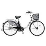 『ビビ・DX』文句なしの充実装備&豊富なカラー。最も愛されるロングセラーモデル□主な特徴■8.9Ahリチウムイオンバッテリー ■ホイールセンサー:よりなめらかな加速とアシスト持続■「エコナビ」機能:自動でムダを見つけて省エネ走行し長距離走行をサポート■タフパワーアシスト:パワフルな新型モーターを搭載しており、よりスムーズで快適な走り出しをサポートします。走行中のアシストの途切れも軽減。■ハードランナータイヤ :外面部が磨耗しにくいタイヤです。■Wピボットハイパワーブレーキ:金属粒子が緻密で強度が上がり、軽く薄くできる鍛造加工でさらにブレーキの強度がアップ。フロントブレーキに採用し、軽い力でしっかりブレーキングします。■サイレントシュー:ブレーキ時のいやな音鳴りがしにくい親切設計。さらに制動力がアップしました。■ステンレスリム:リム、スポークはさびにくく、耐久性に優れたステンレスパーツを採用。長期間美しく乗っていただけます。■大型ドレスガード:保護面積をUPし、巻き込み防止にも効果あり。施錠時に手が触れにくい実用性も配慮。■スリム6-LEDビームランプS:センター配置でタイヤの影が出ない6灯の白く明るいLEDがワイドに照らします。■ソーラーオートテール2:太陽光で充電するから省エネ。暗くなり、振動を感知すると自動点滅を開始します。■スタピタ2:スタンドを立てると同時にハンドルも固定され、ハンドルが左右に振られにくくなります。駐輪時に倒れにくく、お子さまを乗せ降ろしする際に役立ちます。※ハンドルを完全に固定する機能ではありません■ワイドスムースイン樹脂バスケット:大容量化でお買い物にも便利なワイドスムースインオリジナル樹脂バスケット。キズやヘコミに強い樹脂製です。■クッショングリップ:内部を発泡構造にすることによりソフトな握り心地で手にやさしいツートンクッショングリップです。■インサイドベル:親指で操作しやすいタテ型タイプで転倒時の破損防止機能です。■アレックスフレーム:アルミ並みに軽く、強度(抗張力)は従来(普通鋼)の2倍以上で高い評価を得ているパナソニック独自の軽量高張力鋼です。■ミニヒップアップサドル(ガード付):人間工学をもとに開発した、疲れにくくおしりにやさしいサドル形状で、乗車中の負担を軽減します。また、サドル端面全周にガードを装備し、転倒時の破れ易いレザー端面を保護します。■サドルガードマン:いたずらなどで簡単にサドルが抜きとられない機能です。■極太ステンレスリヤキャリア(クラス27):重い荷物や後ろチャイルドシート取り付けに適した丈夫なリヤキャリヤ。■ディンプルキー:とられにくい両面ディンプルキーを採用。差し込む向きも気にせず解錠できます(キー3個付)。後輪サークル錠とバッテリーロックのキーが共通になっています。■かろやかスタンド2:テコの原理で、軽く踏むだけでスッと立つスタンド。驚くほどラクに立てられます。■ステンレスパーツ:リム、スポーク、リヤキャリヤ、ドロヨケ等にさびにくく、耐久性に優れたステンレスパーツを採用。長期間美しく乗っていただけます。■走行距離:(業界統一テスト条件)※走行距離の測定の方法が変わりました パワーモード走行 約31kmオートマチックモード走行 約39kmロングモード走行 約51km■充電時間 約 4.5時間□品番:BE-ELD63S□カラー:プラズマシルバー□タイヤサイズ :26□チェンジ :内装3段□質量(重量) :27.7kg■乗車適応身長/26型:142cm以上■サドル高さ(最低地上高〜最高地上高)/26型:76〜91.5cm■ご注意事項基本的には、組み立てた状態で発送いたします。梱包の都合により付属の工具で簡単な調整(ハンドルの固定等)をしていただく場合があります。あらかじめご了承くださいますよう、お願いいたします。※乗車前には、必ず点検をお願い致します。