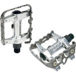 シュアーフット6ボディとケージに設けたWフリップ。グリス注入用ニップル付。□仕様□・素材:アルミボディ&ケージ・ボディ一体型ダブルフリップ・グリス注入口付・クロモリ9/16”アクスル・付属品:リフレクター、スペーサー・L90xW74xH32mm・重さ:322g/ペア・カラー:ガンメタ/シルバーボディ