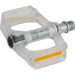 前後に長く、踏み込み易い形状のプラスチック製フラットペダル。