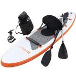 「水面を歩く」。ハワイ発の新感覚マリンスポーツ。 SP1-253 スタンドアップパドルボート ■水面を歩く 大きなボードの上に立ち、パドルを漕いで進む、ハワイ発の新感覚マリンスポーツです。水面を歩くイメージで、波がない海や湖でも楽しめます。 ■インフレータブル構造 付属のポンプで空気を注入するインフレータブル構造です。使用後は空気を抜いて小さく収納することができるので、移動や保管に困りません。 ■シットオンカヤックで シートとフットレストを取り付けて、シットオンカヤックとしてもお楽しみいただけます。※付属のダブルブレードパドル(両端にフィンが付いたパドル)をお勧めします。 大きなボードとパドルを使い、水面を歩くように進む新感覚のマリンスポーツです。サーフィンとは違い波を必要とせず、フラットな海や湖でも楽しめます。発祥地のハワイでは子供からお年寄りまで参加できるポピュラーなマリンスポーツとして知られています。不安定なボード上でのパドリングは、太もも、二の腕、お腹まわりの刺激にもなり、体幹エクササイズとしても注目です。 ■製品スペック カラー ホワイト×オレンジ サイズ L2920×H100×D770(mm)※インフレータブルという性質上、空気の注入度合いによって変化します 収納サイズ D250×H1000×W650(mm)※収納方法により差があります 重量 約16kg 材質 ラミネートPVC 気室 1 耐荷重量 100kg 定員 大人1名 付属品 フィン1枚(ネジ、ナット付き)・フットレスト1本・パドル2種類・シート1個・フットポンプ1個・キャリングバッグ1個・バルブ交換用工具 ※製品等の色は、ご使用になるモニターや、設定によって若干の違いが発生する場合があります。※製品改良のため予告なくデザイン・仕様を変更する場合があります。※安全のため本製品をご使用する前日に、一度付属のポンプで空気を入れ一日放置して空気漏れが無いか確認してください。※空気漏れの確認は使用する都度、毎回行ってください。※本製品はPVC製品のため、処分される際はお住まいの地方自治体の規則に従い、処分を行ってください※ご使用の際はライフベストを着用ください。※安全確保のため、単独でのご使用は避けてください。※水上での移動は想像以上に体力を消耗します。常に帰路に必要な体力を残しておいてください。
