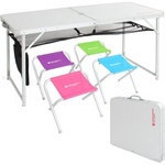ハッピーテーブルセット TB5-111カラフルなレジャーシーンを演出。テーブル×1、チェア×4のハッピーテーブルセット。テーブルの中にチェアが4脚収納されたコンパクトなハッピーテーブルセット。野外にこのセットを1つ持っていくだけで、レジャーシーンがぐっと華やかでハッピーになるカラフルなデザインです。テーブルは55cm/67cm/78cmの3段階で高さ調節ができ、近年流行のロースタイルから、従来のハイスタイルまでに対応します。また、テーブル下のストレージネットや日陰を作り出す為のパラソル穴も標準装備され、使用者の好みに応じて自由な使い方が可能です。デザイン・機能の両面で、空間をハッピーにする新しいテーブルセットです。□製品仕様□型番:TB5-111カラー:ホワイトサイズ:【テーブル】(約)L1200×W600×H780/670/550mm 【チェア】(約)L400xW300xH330cm収納サイズ:(約)L600×W600×H70mm重量:【セット】(約)7.4kg 【テーブル】(約)5.2.kg 【チェア】(約)550g材質:【テーブル】フレーム:アルミニウム、天板:MDF 【チェア】フレーム:アルミニウム、座面:ポリエステル耐荷重量:【テーブル】30kg 【チェア】80kg個装サイズ:640×640×80mm個装重量:7.4kg付属品:ストレージネットパラソル穴取付キャップ取扱説明書※ 製品等の色は、ご使用になるモニターや、設定によって若干の違いが発生する場合があります。 ※ 製品改良のため予告なくデザイン・仕様を変更する場合があります。※ 高さ調節の説明にある高さ67cmは、2種類の延長ポールの内、長い方を使用した場合の高さです。 短い方の延長ポールを使用した場合は、高さ65.5cmになります。